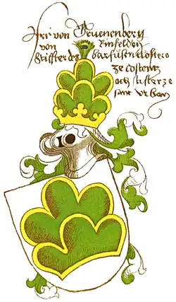 3. Rudolf von Stillfried-Rattonitz, Graf von Alcántara, und Adolf Matthias Hildebrandt (Hrsg.): Des Conrad Grünenberg, Ritters und Burgers zu Constenz, Wappenbuch. Volbracht am nünden Tag des Abrellen do man zalt tusend vierhundert drü und achtzig jar. Rhenania Buchversand, Koblenz 2009, S. XCIIIIb (Faksimilereprint der Originalausgabe C. A. Starke, Görlitz 1875–1884).