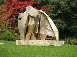 Unterhalb des Festspielhauses sind überlebensgroße Bronze-Porträts von Franz Liszt, Richard Wagner und Cosima Wagner im Garten des Festspielparks aufgestellt, die Arno Breker angeblich im Auftrag der Stadt Bayreuth 1955 bis 1979 schuf.[8] Die Wagner-Büste – sie kam 1976 hinzu –[9] hatte Breker allerdings schon 1939 geschaffen.[10] Am Eingang zum Festspielpark wurde am 9. Juli 1963 die Bronzestatue eines Mannes mit seitwärts ausgestreckten Armen aufgestellt, 'Prometheus' von Frans Huygelen.[11] Karin Neukam schrieb über Huygelens' Schöpfung: „Sein Prometheus ist der machtberauschte, stolze und geniale Titan, der den von ihm geschaffenen Menschen verbunden ist, ihnen die Anfänge der Kultur vermittelt und sie gegen den Willen des Zeus mit dem Feuer beglückt. In seinem rechten erhobenen Arm hält er den markigen Stengel eines Riesenfenchels, mit dem er das Feuer vom Olymp den Sterblichen als viertes Element zu Erde, Luft und Wasser beschert. Mit seiner linken Hand umfasste Prometheus ursprünglich ein Bündel Blitze, das ihm jedoch 1970 über Nacht entwendet wurde. Bis heute wurde es auch nicht wieder ersetzt.“[12] Bayreuther Bürger störten sich 1963 an der Nacktheit der Figur (es fehlt ihnen ein Feigenblatt)[13], nicht aber daran, dass sie Assoziationen weckt an die Monumentalplastiken Wehrmacht und Partei von Arno Breker im Eingangsbereich („Ehrenhof“) von Hitlers Reichskanzlei.