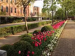 Der Grüne Hügel beginnt am Fuß des Richard-Wagner-Parks, der von der nach Wagners Sohn Siegfried benannten Siegfried-Wagner-Allee mittig durchschnitten wird. Die am Hang geradlinig ansteigende Straße ist die Blickachse zum Festspielhaus, dessen Vorbau (Königsbau) erst 1882 für Ludwig II. errichtet wurde.[14] Vor dem Festspielhaus knickt sie nach links ab und umgeht das Gebäude auf dessen Westseite.