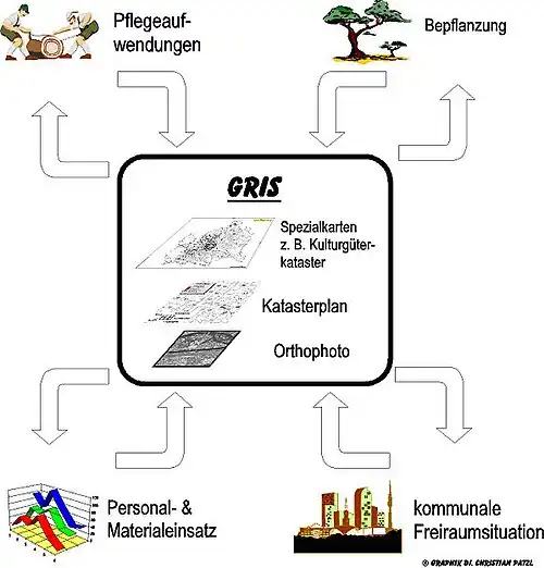 Ein digitales Grünflächeninformationssystem (GRIS) ist die Voraussetzung für ein effizientes Grünflächenmanagement. Bedingung ist eine geeignete und konsequent geführte Datenbasis in Form eines Grünflächenkatasters. Darin finden sich nicht nur alle Grünflächen, sondern auch deren jeweilige Ausstattung und Inventar, wie Angaben über Flächeninhalte, topographische Lage (→ Hangneigungen, Exposition), Bepflanzung (→ Gebrauchsrasen, Wiesenflächen, Blumenrabatte, Strauchpflanzungen, Bäume). Durch die Verknüpfung mit ökologischen und sozialen Daten bietet das GRIS ideale Grundlagen für die Grünordnung und Objektplanung. Es liefert jene Daten, welche die Freiraumsituation einer Kommune widerspiegeln, und ermöglicht darüber hinaus den interkommunalen Vergleich.