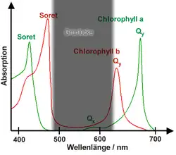 Da Chlorophyll die Lichtquanten außerhalb dieser Grünlücke in den Blättern und Gräsern absorbiert, wird nur der Spektralbereich um 555 nm remittiert. Dieser Farbreiz verursacht beim Menschen die Farbvalenz Grün. Dies erklärt, warum Pflanzen für das menschliche Auge grün erscheinen. Die chemische Struktur von Chlorophyll bedingt diese für eine Photosynthese ungenutzte Energie. Die stammesgeschichtliche Entwicklung des Chlorophylls als Energiespender für höhere Pflanzen unterlag noch weiteren Einflüssen. Bekanntermaßen besitzen auch nicht alle Tiere den Sichtbarkeitsbereich wie der Mensch.[1]