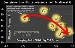 Der Futterwert[14] spiegelt den rein ökonomischen Wert des Erntematerials wider und weicht von dem gesamtgesellschaftlichen Wert der Arten ab. Eine Hervorhebung dieser Einteilung ist der erhöhten Konzentration auf Gehaltwerte von für landwirtschaftliche Produktion verwendeten Pflanzen in den letzten Jahrzehnten geschuldet. Die folgenden Tabellen und Listen geben eine Futterbewertung einiger Graslandpflanzen im Rahmen der Bestimmung von Qualitätsklassen von Weidefutter in der DDR aus dem Jahr 1986 an.[14] Dabei liegt ein Zusammenhang zwischen geringem Futterwert und dem Gefährdungsgrad gemäß der Roten Liste vor.[15]