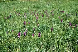 Unter Extensivgrünland – bzw. artenreichem Grünland – sind vorwiegend 1-3-schürige Heu- und Öhmdwiesen zu verstehen. Es gehören aber auch langjährig extensiv bewirtschaftete Weiden in Höhenlagen dazu. Solches Grünland wird standortgerecht genutzt und erfährt nur eine teilweise Rückführung der Nährstoffe über Wirtschaftsdünger (Stallmist, Jauche, Gülle). Die Pflanzenbestände weisen einen mittleren Futterwert auf und nehmen auch im Arteninventar eine Mittelstellung zwischen dem Wirtschafts- und dem Biotopgrünland ein. Die Anzahl der Pflanzenarten ist mit 30 bis 45 pro 25 m² Referenzfläche vergleichsweise hoch und die Aspekte sind blütenbunt (siehe auch Blumenwiese). Das mitteleuropäische Grünland kann bei besonders günstigen standörtlichen Bedingungen und extensiver Nutzung eine Pflanzenartenvielfalt pro m² erreichen, die ansonsten nur im tropischen Regenwald anzutreffen ist. Im Maximum wurden 89 Pflanzenarten auf einem Quadratmeter festgestellt.[12] In die Kategorie Extensivgrünland gehören auch die beiden mesophilen Grünlandtypen magere Flachland-Mähwiese (FFH-Code 6510) und Berg-Mähwiese (FFH-Code 6520), die durch die Fauna-Flora-Habitat-Richtlinie (FFH) geschützt werden.