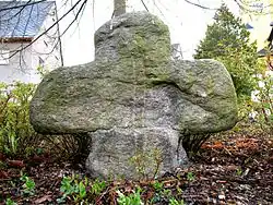 Auf dem Gottfried-Heinrich-Stölzel-Platz unterhalb der Kirche befindet sich auf einer kleinen Grünfläche ein Sühnekreuz, auf dessen Vorderseite Reste eines eingeritzten Schwertes zu erkennen sind. Das 82 cm hohe Granulit-Kreuz wurde 1993 von seinem früheren Standpunkt an der heutigen B 101 zum Schutz vor Zerstörung hierher versetzt. Warum das Sühnekreuz errichtet wurde, ist nicht belegt. Nach verschiedenen Überlieferungen gerieten zwei Männer, vielleicht Soldaten, in Streit und einer erschlug den anderen[4].