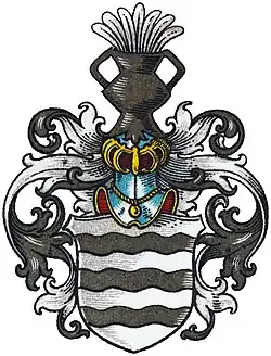 Blasonierung: In Silber drei querfließende schwarze Bäche. Auf dem Helm mit schwarz-silbernen Helmdecken eine schwarze, an beiden Seiten gehenkelte Vase mit sieben silbernen Federn besteckt.[1]