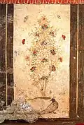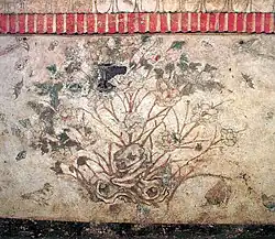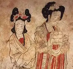 Auf zwei bemalten Marmorreliefs ist eine Gruppe von Dienerinnen sowie ein fünfzehnköpfiges Damenorchester zu sehen.[1][2] Es gibt Aufschlüsse über den Musikgeschmack der Oberschicht der ausgehenden Tang-Dynastie.