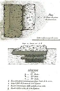 Unter einer Gruppe von Felsplatten, die die Decke bilden, liegt ein 4,6 m in den Boden eingetiefter Grabraum, in dem Skelette und Grabbeigaben gefunden wurden. Der Raum ist etwa 3,0 m breit, mit Höhen zwischen 0,7 und 1,25 m. Er enthielt die Reste von 133 Menschen jeden Alters, geschliffene Äxte und Messer aus Feuerstein, Hirschgeweihe, Kreideringe, ein Schieferfragment, Zähne von Bären und Hirschen, sowie Töpferware.