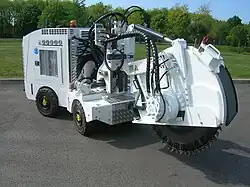 Grabenfräsen verfügen über eine vertikal schwenkbare Fräseinrichtung, die entweder mit einer Fräskette oder einem Fräsrad mit Rundschaftmeißeln ausgestattet ist.[3]