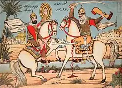 Kampf zwischen ʿAlī ibn Abī Tālib (links) und Amr ibn 'Abd Wudd (rechts) während der Grabenschlacht