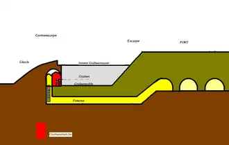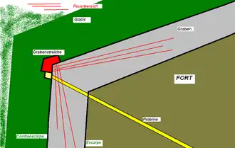 Nach der allgemeinen Einführung der Brisanzmunition ab 1890[8] und der dadurch gesteigerten Wirkung der Belagerungsartillerie wurden zur Bestreichung der Front- und Flankengräben Grabenstreichen in der Contrescarpe (also auf der feindseitigen Grabenseite) eingebaut, wo sie der Belagerungsartillerie entzogen und gelegentlich durch Poternen mit dem Hauptwerk verbunden waren. Dies gilt bereits für die ab 1886 gebauten Forts um Kopenhagen[9] und die ab 1888 errichteten Forts um Namur und Lüttich und ebenso für die deutschen Festen um Metz,[10] die französischen Forts,[11] sowie für die meisten Befestigungen in Österreich-Ungarn,[12] wo bei den kompakten Einheitswerken in den Alpen bis 1907 auch an Fronten und Flanken weiterhin „Koffer“ vor der Escarpe gebaut wurden. Auch zahlreiche zwischen 1870 und 1886 errichtete Forts, beispielsweise um Straßburg oder die französischen Séré de Rivières’, wurden angepasst, indem die Kaponnieren an Flanken und Facen abgetragen und stattdessen Grabenstreichen in der Contrescarpe errichtet wurden. Die Kehlgräben der neuen wie der modernisierten Forts wurden meist weiterhin aus der dem feindlichen Belagerungsfeuer abgewandten Escarpe der Kehlseite bestrichen, wobei unterschiedliche Lösungen verwendet wurden, wie Kasematten in der Kehlkaserne, Kaponnieren oder Kasematten in jeweils einem einspringenden Winkel (Flanken) der Kehlmauer, die sich links und rechts vom Eingangstor befanden, wie beispielsweise im Fort Douaumont von Verdun.[13] Auch wurden zur Bestreichung der Kehlseite Grabenstreichen in die Contrescarpe eingebaut, wie etwa in den dreieckigen Forts der „Feste Kaiser Wilhelm II.“ bei Straßburg.[14]