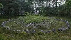 An den Steinkranz, der zu drei Vierteln von einem offenen Graben umgeben war, schließt sich im Osten ein nahezu rechteckiger Vorplatz von etwa 650 m² an, innerhalb dessen sich, nahe dem Steinkranz, kleine hakenförmige und bogenförmige Steinsetzungen befinden, die beiden so genannten „Kultnischen“. Eine rechteckige Verfärbung, vielleicht die Reste eines Holzbaues, liegt auf dem Vorplatz, der mit dem Kult in Zusammenhang zu stehen scheint, worauf sich auch bei Grabhügeln der Umgebung (Gräberfeld in der Addenstorfer Heide) Hinweise fanden.