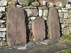 Vierzehn Grabplatten aus Sandstein wurden im Süden und Osten der Kirche auf dem alten Friedhof gefunden. Zwischen 1990 und 1992 erstellte Cillian Rogers Repliken von zwölf von ihnen, diese wurden im Jahr 1992 vor Ort aufgestellt. Die aus der keltischen Eisenzeit abgeleiteten Designs sind aufwendiger als die jedes anderen Friedhofs im County Sligo, bis auf die von Inishmurray, Nr. 2 und 3. Einige der Entwürfe sind aus verschiedenen Gründen hervorragend, mitunter sogar einzigartig. Zu den symbolhaften Darstellungen gehören Ellipsenbänder, Knotenmuster, einfache Kreuze, Kreise, Schachbrettmuster und Triskelen. Die Platte Nr. 10 trägt eine einzigartige figurative Darstellung und ist auf der Rückseite mit Knotenmustern verziert; sie war dazu bestimmt aufrecht gesetzt zu werden. Die Platte Nr. 3 ist im Design ähnlich einem aus dem Buch von Durrow aus dem 7. Jahrhundert. Ins 7. und 8. Jahrhundert werden viele der Platten eingeordnet. Auf den Platten Nr. 3, 4, 5, 6, 8 und 11 ist das Design erhaben.
