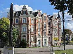 - Nr. 7: 3-gesch. Wohn- und Bürohaus (D) mit Ecktürmchen und zwei barockisierenden Giebeln; Eigentum der Rittergutsbesitzerin Margarete Diestel, 1935 von Rudolph Karstadt als Alterssitz gekauft.[2]
