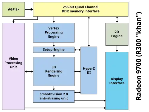 | R300 | R300, R350, RV350, RV380, RS400, RS480 | 9500 – 9800, X300 – X600, X1050 – X1150, 200M | ATI-Radeon-9000-Serie, ATI-Radeon-X-Serie, ATI-Radeon-X1000-Serie |
