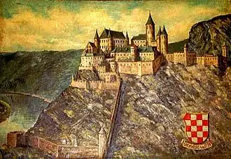 - Johann I., der älteste Sohn, erhielt die Hintere Grafschaft Sponheim mit Gütern im Mosel- und Nahegebiet (Wappen: Schachbrett Rot-Silber) mit Sitz auf der Starkenburg bei Enkirch.[15] Weiterhin erbte er 1247 die Grafschaft Sayn. Dessen Söhne teilten 1265: