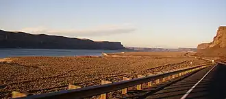 Die Grand Coulee, unten die Dry Falls. Die Schichtung der periodischen Lavaflüsse ist sichtbar. | |