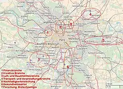 - Die dritte Zone Paris Métropole hat 2546 km² und 9,32 Millionen Einwohner.[7] Sie ist ein Zusammenschluss von Paris, der Region Île-de-France und von Städten und Gemeinden, die sich selbst als Teil der Agglomeration sehen. Diese Gruppe bildet circa 90 % des Ballungsraums und muss zu allen Veränderungen der Struktur des Großraums Paris gehört werden. Sie ist in der Öffentlichkeit relativ unbekannt.