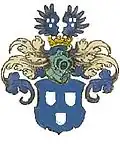 - Schild: In blau drei silberne Schilde (2,1). Helm: Bügelhelm. Helmzier: Adelskrone mit offenem Flug in blau mit je drei silbernen Schilden. Halskleinod.