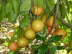 Die Grapefruit (Citrus × paradisi), selten auch Adamsapfel oder Paradiesapfel[1] genannt, ist die Frucht des Grapefruitbaumes, einer Zitruspflanze, die ein subtropischer Baum aus der Familie der Rautengewächse (Rutaceae) ist. Sie ist eine Kreuzung, die aus der Orange (Citrus × sinensis) und Pampelmuse (Citrus maxima) entstanden ist.[2] In der Umgangssprache (besonders in Norddeutschland) wird sie deswegen auch häufig als Pampelmuse bezeichnet. Der Name Grapefruit ist eine Zusammensetzung der englischen Wörter grape für Traube und fruit für Frucht. Er bezieht sich auf die weinrebenartige Form, in der die Früchte am Baum wachsen. Weitere Bezeichnungen sind Kürbisorange und Melonenorange.[3]