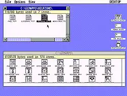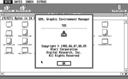 - Der Desktop ist der Dateimanager und Programmstarter, der wie eine Schreibtisch-Arbeitsfläche aussieht. Der Desktop 2.x hat aufgrund des Rechtsstreits mit Apple nur noch zwei Fenster fester Größe, aber es ist möglich, Desktop 1.x mit GEM 2.x zu verwenden.