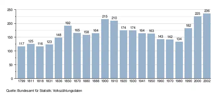 - ↑ Daten der Eidgenössischen Volkszählungen ab 1850 nach Gemeinden. (XLSX; 10 MB) Bundesamt für Statistik, Neuchâtel, 12. Juli 2024, abgerufen am 3. Juni 2025 (Öffnung in Excel nur über "Anhang/Excel-Datensatz" möglich).