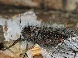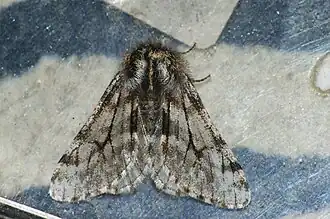 Die Falter erreichen eine Flügelspannweite von 27 bis 33 Millimetern.[2] Zwischen den Geschlechtern besteht ein erheblicher Sexualdimorphismus. Die Flügel der Männchen sind weißgrau gefärbt, dünn beschuppt und pergamentartig. Die Adern sind schwarz bestäubt, die Fransen schwarz und weißgrau gescheckt. Auf der Vorderflügeloberseite heben sich zwei schwärzliche Querlinien sowie ein dunkler Mittelschatten meist undeutlich ab. Die flugunfähigen Weibchen besitzen nur sehr kurze schwarze Flügelstummel, die lanzettartig geformt sind. Der Körper ist lang weißlich und kurz orangerot behaart. Die Fühler der Männchen sind gekämmt und bei den Weibchen fadenförmig.
