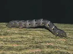 Ausgewachsene Raupen haben eine gelbgraue bis violett braune Farbe, von der sich der weißliche bis gelbliche Kragen sowie die gleichfarbigen Segmenteinschnitte abheben. Die gesamte Körperoberfläche ist mit sehr kleinen schwarzen Punkten überzogen. Die Rückenlinien sind zumeist in dunkelbraune Flecke aufgelöst. Der gelbe Seitenstreifen ist mehrfach unterbrochen. Die gelbbraune Kopfkapsel ist schwarz gepunktet.