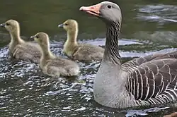 Die Graugans (Anser anser, früher auch Anas anser L.), häufig kurz Gans genannt, ist eine Art der Gattung Feldgänse (Anser) in der Familie der Entenvögel (Anatidae). Graugänse zählen zu den häufigsten Wasservögeln und sind, nach der Kanadagans, die zweitgrößte Gänseart in Europa. Sie sind die wilden Vorfahren der domestizierten Hausgänse. Mitteleuropa gilt als die Region, in der diese Gans domestiziert wurde.[1] Auf die verwandten Schwanengänse (Anser cygnoides) gehen die domestizierten asiatischen Höckergänse zurück. Die Graugans wurde von Carl von Linné 1758 in seinem Werk Systema naturae beschrieben.