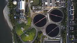 Südlich des Hafens liegt am Rande eines Wohngebiets die Kläranlage Salierweg, die 1934 errichtet und 1958 sowie von 1977 bis 1985 und nochmals ab 1989[2] nach einem Architekturwettbewerb für die Modernisierung der mechanischen Reinigungsstufe[3] grundlegend erweitert und neugestaltet wurde.[4][5] Sie ist für die Abwasserbeseitigung von 22 Ortsteilen der Stadt Bonn und teilweise der Gemeinde Alfter sowie für die Verbrennung des Klärschlamms aus den anderen Klärwerken der Stadt und aus Königswinter[5] zuständig.[6][7] Als Verbindung von Hochbau- und Landschaftsarchitektur erhielten die Faulbehälter mit einer Höhe von etwa 20 m durch Erdaufschüttungen in Form einer kegelförmigen Ummantelung eine im Stadtbild markante grüne Haube.[8] Der Schornstein der Verbrennungsanlage ist rund 70 Meter hoch.[5]