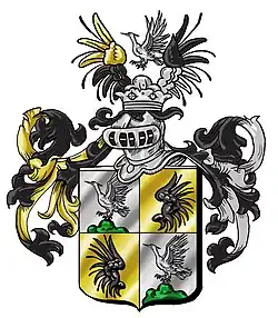 Geviert, 1 und 4 in Silber ein von einem grünen Dreiberg auffliegender grauer Vogel, 2 und 3 im Geviert einwärts ein schwarzer Flügel. Auf dem Helm mit links schwarz-goldenen sowie rechts schwarz-silbernen Decken der vom Dreiberg auffliegende Vogel zwischen offenem, links von Schwarz und Gold, rechts von Silber und Schwarz geteilte Flug.