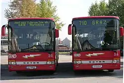 Der Busbetrieb wurde 1935 aufgenommen, der Genehmigungsbescheid trägt das Datum 11. Mai 1935. Die Autobuslinien werden seit den 1990er-Jahren im Rahmen des Steirischen Verkehrsverbundes teilweise gemeinsam mit anderen Busunternehmen wie Dr. Richard Steiermark (ehemals Watzke) betrieben.[66] 2025 erhielt die GKB wieder den Zuschlag für den Betrieb der Buslinien um Deutschlandsberg („Busbündel Deutschlandsberg“).[67] Neben dem Linienbetrieb, der vor allem Schüler und Pendler aus der Weststeiermark zu den Arbeits- und Schulzentren bis nach Graz bringt, werden auch Sonder- und Reisefahrten angeboten. Außer dem Graz Köflacherbahnhof mit der Verwaltung des Busbetriebs und der Autobuswerkstätte werden vom Busbetrieb noch die Kraftwagenbetriebsstätten in Stainz und Köflach betrieben.