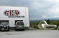 GKB-Werkstättengebäude in Lieboch mit der Skulptur von Manfred Wakolbinger (2008)
