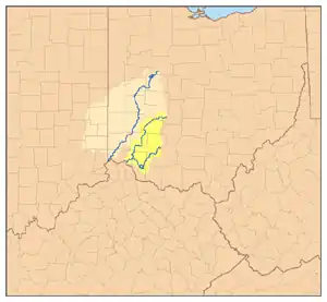![]() Einzugsgebiet des Great Miami River (beige) im Westen. Im Osten der Little Miami River (Einzugsgebiet gelb dargestellt) | ||