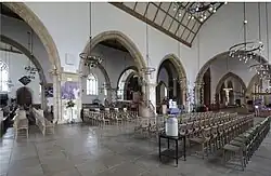Der Grundriss der mit einem Querhaus versehenen Kirche entspricht dem eines lateinischen Kreuzes. Die Einteilung durch Spitzbogenarkaden in mehrere Schiffe und deren hölzerne Decken sind typisch für gotische englische Hallenkirchen und für gotische englische Pfarrkirchen überhaupt. Die drei Schiffe des Langhauses haben die für englische Hallenkirchen typischen Paralleldächer. Außergewöhnlich ist die Verbindung breiterer Seitenschiffe mit einem schmaleren Mittelschiff, die Breite von Mittelschiff und Querhaus war seit der Anfangszeit dieses Bauwerks durch den Vierungsturm vorgegeben. Alle drei Schiffe sind mit kassettierte und polygonalen hölzernen Tonnengewölben gedeckt, die auch als ceiled wagon roof bezeichnet werden, im Unterschied zum echten wagon roof („Planwagendach“),[2] bei dem nan durch den Dachstuhl bis an die Dachschrägen sehen kann. Im Chorbereich hat nur das Mittelschiff, der eigentliche Chor einen solchen ceiled wagon foof,[3] die im fünfschiffigen Teil des Chors auch als Kapellen bezeichneten Seitenschiffe haben flache Decken, die etwa in Basishöhe der Basis der Mittelschiffstonne liegen, so dass dieser Teil der Kirche sowohl als Hallenkirche als auch als Pseudobasilika bezeichnet werden kann.