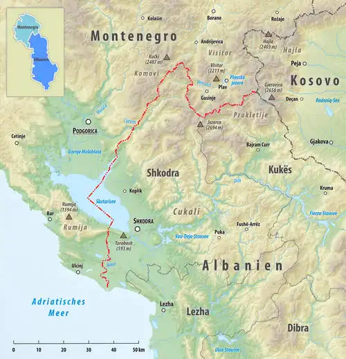 Die gemeinsame Staatsgrenze führt in nordöstlicher Richtung von der Adria in den Hauptkamm des Dinarischen Gebirges im Prokletije (Albanische Alpen).