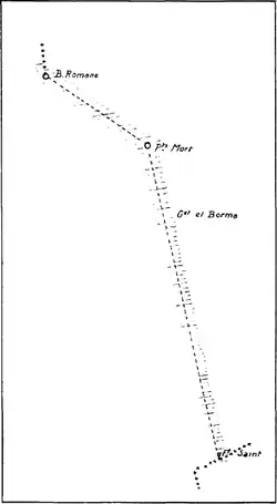 Die Grenze verläuft östlich der algerischen Orte Lacroix. Roum el Souk, Oued Mougras, Sidi Fhrerib, Mechtat Ahmed, Ouenza, Aïn Zerga, Ain Kouif, Tébessa und Oum Ali und westlich der tunesischen Orte Tabarka, Ain Draham, Ghardimaou, Hennchir Abid, Sakiet Sidi Youssef, Charpin Ville, Haïdra, Ain Amara, Dernaia, Moularès und Tamerza. Sie führt westlich am Chott el Djerid vorbei und lässt Hazoua auf tunesischer Seite. Weiter verläuft sie in südöstlicher Richtung durch die Sandwüste des östlichen Großen Erg über El Borna fast geradlinig durch bis zu ihrem Ende am Dreiländereck (Grenzstein 220; 30°14'24"N, 9°34'48"E) mit Libyen knapp nördlich vom libyschen Ghadames.[3]