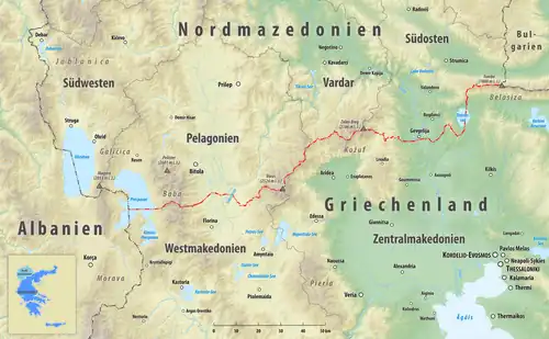 Die Grenze verläuft grob in West-Nordost-Richtung. Nördlich befindet sich Nordmazedonien und südlich Griechenland. Von West nach Ost befinden sich u. a. folgende Landmarken: der Prespasee, das Gebirge Kajmakčalan, der Fluss Vardar, der Dojransee und das Gebirge Belasiza.