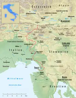 Die Grenze zwischen Italien und Slowenien hat eine Länge von 218 km.[1] Ihr gegenwärtiger Verlauf wurde mit Ausnahme des Gebiets des ehemaligen Freistaats Triest als Grenze zum damaligen Jugoslawien durch den Friedensvertrag mit Italien am 10. Februar 1947 festgelegt, nachdem die italienisch-jugoslawische Grenze in der Zwischenkriegszeit wesentlich weiter östlich verlaufen war und insbesondere den gesamten Einzugsbereich des Isonzo Italien zugewiesen hatte. Im Gebiet des ehemaligen Freistaats Triest erfolgte die Festlegung des Grenzverlaufs durch das Londoner Memorandum 1954 und völkerrechtlich durch den Vertrag von Osimo zwischen Italien und Jugoslawien 1975.