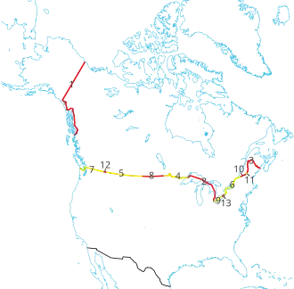 Die Grenze zwischen Kanada und den Vereinigten Staaten ist mit 8891 Kilometern und 120 Übergängen die weltweit längste Grenze zwischen zwei Staaten. Diese Grenze – die von keiner Seite militärisch gesichert ist – führt über Land und kurze maritime Abschnitte im Küstenbereich des Atlantiks, des Pazifiks, des Arktischen Ozeanes und der Großen Seen. Davon entfallen 2487 Kilometer auf die Grenze zwischen Kanada und dem vom Hauptteil der Vereinigten Staaten getrennt im Norden liegenden US-Bundesstaat Alaska. Die südliche Grenze Kanadas zu den Vereinigten Staaten misst 6404 Kilometer. Dabei folgt sie westlich der kanadischen Provinz Ontario im Wesentlichen dem 49. Breitengrad. Die Endpunkte der südlichen Landgrenze sind die Passamaquoddy Bay am Atlantik im Westen und die Juan-de-Fuca-Straße am Pazifik im Osten. Die Endpunkte der Landgrenze Kanadas zu Alaska sind der Dixon Entrance im Süden und die Küste der Beaufortsee im Norden.[1]