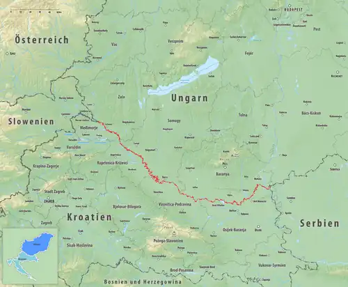 68-as főút, die hier mit der 6-os főút zusammentrifft, auf kroatischer Državna cesta D5). Nach Westen nimmt die Grenze einen stark mäandrierenden Verlauf, bis sie sich westlich des ungarischen Bélavár von der Drau entfernt und nördlich des Flusses verläuft. Zu Kroatien gehört die Gemeinde Gola nördlich der Drau mit einem Straßenübergang in das ungarische Berzence. Dabei bleibt die zum Bahnknoten Gyékényes bei Zákány führende Eisenbahnstrecke immer auf ungarischem Gebiet. Bei Zákány besteht ein Eisenbahnübergang an der Hauptstrecke von Budapest nach Zagreb. Hier erreicht die Grenze wieder die Drau, deren Lauf sie bis zur Einmündung der Mur (Mura) folgt. Zwischen Murakeresztúr (Ungarn) und Kotoriba (Kroatien) überquert die Bahnstrecke Nagykanizsa-Čakovec die Grenze, beim ungarischen Letenye die Autobahn von Budapest nach Zagreb (auf ungarischer Seite Autópálya M7, auf kroatischer Autocesta A4, zugleich Europastraße 65 und Europastraße 71). Südlich des ungarischen Muraszemenye endet die kroatisch-ungarische Grenze am Dreiländereck mit Slowenien an der Mündung der Ledava (ungarisch Lendva, deutsch Limbach), jedoch ist der Grenzverlauf bis zur Mündung der vom ungarischen Lenti kommenden Kerka ungeklärt, wobei sich das slowenisch-kroatisch-ungarische Dreiländereck nach slowenischer Angabe etwa 300 Meter nordwestlich der Mündung in die Mur befindet, nach ungarischer Angabe etwa 200 Meter südöstlich des Zusammenflusses Ledava–Kerka.