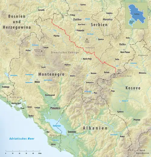 Im Norden nimmt die Grenze am Dreiländereck mit Bosnien und Herzegowina rund 400 m nordöstlich des Bergs Zelena Glava ihren Ausgang, verläuft dann zunächst nach Süden und quert das Tal Poblačnica (Grenzübergang Metaljka nach Bosnien und Herzegowina) und verläuft auf der Höhe des Gebirgsstocks Kovač nach Südosten und dabei nördlich an dem montenegrinischen Industriezentrum Pljevlja (kyrillisch Пљевља) vorbei und weiter im Westen des serbischen Dorfs Mataruge (kyrillisch Матаруге), bis sie das Tal des Lim erreicht und nördlich des montenegrinischen Bijelo Polje (kyrillisch Бијело Поље) diesen Fluss sowie die Europastraße 763 und die Bahnstrecke Belgrad–Bar quert. Die Grenze setzt sich nach Südosten durch dünn besiedeltes Gebiet über die Berge Zilindar (1616 m) und Krstača (1758 m) fort und quert rund 20 km östlich von Rožaje (kyrillisch Рожаје) den Oberlauf des Flusses Ibar sowie die Europastraße 80 (Grenzübergang Dračenovac). Rund 6 km weiter südlich geht sie am Berg Mokra gora in die Grenze zwischen Montenegro und dem Kosovo über.