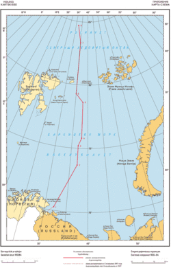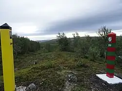 - ↑ Grenzmarkierungen für Norwegen (gelb) und Russland (rot und grün) befinden sich jeweils zwei Meter von der vermessenen Grenze entfernt.