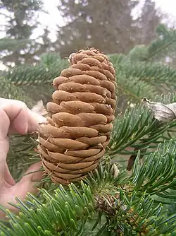 Die fast zylindrisch geformten, stark verharzten Zapfen werden 10 bis 20 Zentimeter lang und 3 bis 5 Zentimeter dick. Sie sind zur Reife im August bis September von violett über bräunlich rot und gelbbraun bis braun gefärbt. Man findet sie vor allem im oberen Kronenbereich, wo sie an den Spitzen von vorjährigen Trieben stehen. Unter den keilförmigen, 2 bis 4 Millimeter langen und ebenso breiten Samenschuppen ragen die zurückgebogenen, goldbraunen Deckschuppen hervor. Die Samen werden im Oktober aus den Zapfen entlassen.[4][2]