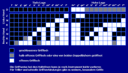 Bei Blasinstrumenten wie der Blockflöte zeigt die Grifftabelle üblicherweise in chromatischer Reihenfolge, welche Löcher oder Klappen für einen bestimmten Ton zu schließen bzw. zu öffnen sind.