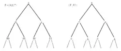 Notationen: Die Ecken des Binärbaumes werden beschrieben durch endliche Folgen von Elementen aus . Seien bzw. die Teilbäume aus denjenigen Folgen, die mit 0 bzw. 1 beginnen. Die Abbildungen bzw. bilden eine Folge auf die Konkatenation bzw. ab. Für zwei Automorphismen sei