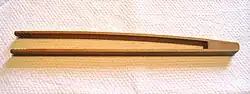 Grillzangen aus Holz sind in der Regel aus Buchenholz gefertigt, da dieses lebensmittelecht und nicht gesundheitsbedenklich ist. Grillzangen aus rostfreiem Stahl sind hitzebeständiger als Grillzangen aus Holz und können auch direkt in die Glut greifen und eignen sich auch zum Grillen über offenem Feuer. Der lange Griff der Zange verhindert Verbrennungen bei Benutzung an einem Holzkohle- oder Gasgrill oder über einer offenen Feuerstelle. Damit die Hitze bei Zangen aus Metall nicht weitergeleitet werden kann, haben diese einen Griff oder Griffschalen aus Leder, Kunststoff oder Holz. Grillzangen gibt es in diversen unterschiedlichen Ausführungen. Meist bestehen sie entweder aus zwei Teilen, die wie eine Schere in der Mitte zusammengefügt sind, oder aus nur einem Bauteil, das in der Mitte gebogen ist.[1]
