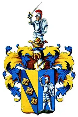 Blasonierung des Wappens von 1797: Gespalten, rechts in Gold ein mit 3 vierblättrigen goldenen Blüten belegter blauer Schrägrechtsbalken, links in Blau auf grünem Rasen ein Geharnischter mit offenem Visier, der Helm mit einem roten Busch besteckt, in der Rechten ein gold-begrifftes Schwert schwingend, in der Linken einen runden Schild haltend; auf dem gekrönten Helm mit blau-goldenen Decken der Geharnischte wachsend.