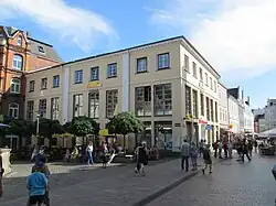 - Große Straße 15-19: ein 1906 erbautes Wohn- und Geschäftshaus.[54] Ein Stolperstein vor dem Haus erinnert an das Schicksal von Heinrich Lazarus. 1937 hatte das Ehepaar Louis und Cora Lazarus in dem Haus eine neue Wohnung bezogen. Diese wurde während der Novemberpogrome 1938 von der Gestapo, auf Grund des jüdischen Hintergrundes der Familie Lazarus, verwüstet. Das Ehepaar Lazarus wurde zusammen mit ihrem Sohn Heinrich, der seine Eltern besuchte, verhaftet. Die Eltern kamen kurz darauf wieder frei, doch der Sohn wurde ins KZ Sachsenhausen gebracht. Nachdem er sich ausreisewillig erklärte, kam er im Dezember 1938 frei, so dass er mit seiner Frau und seinem kleinen Sohn in die Niederlande flüchten konnte. Die Eltern zogen Anfang 1939 zu ihrer Tochter Annie nach Kopenhagen um. Heinrich Lazarus wurde, während der deutschen Besatzung der Niederlande verhaftet, nach Auschwitz verschleppt und im Dezember 1942 ermordet. Heinrichs Frau und sein Sohn konnten untertauchen und wanderten 1948 in die USA aus.[55][56]