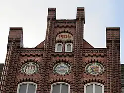 - Große Straße 36 (beziehungsweise Speicherlinie 22a): Wohn- und Geschäftshaus von Alexander Wilhelm Prale aus dem Jahh 1890,[71] an dem sich eine Flensburgwappenvariation als Werbung für eine Spirituose befindet. Das Flensburgwappen wurde im Laufe der Zeit immer wieder variiert und für Werbezwecke genutzt. Eine alte Flensburger Sage beschreibt offensichtlich ein solches „Flaschen-Wappen“. — Nach einer Schlacht des Dänisch-Schwedischen Krieges, welche Dänemark gewonnen hatte, erhielt ein einfacher Soldat aus Flensburg den Befehl, das Schlachtfeld zu bewachen. Als dieser, durstig geworden, in seine Manteltasche griff und eine Flasche mit seinem Wohltrunk herauszog, hörte er plötzlich neben sich die Stimme eines Schweden, dem beide Beine abgeschossen waren und der nun flehentlich um einen Schluck bat. Mitleidig reichte der Flensburger Soldat dem Verwundeten die Flasche. Doch der tückische Schwede ergriff seine Pistole und feuerte sie, in der Hoffnung so die ganze Flasche zu erhalten, ab. Aber der Schuss ging fehl. Der Flensburger Soldat trank daraufhin, die „wohlgefüllte“ Flasche halb aus und reichte sie erst danach wieder dem Sterbenden, mit den Worten: „Da, du Schlingel! Nun kriegst du sie nur halb!“ Als der König davon erfuhr, gab er dem Flensburger Soldaten ein Wappen mit einer halb gefüllten Flasche.[72]