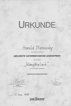 - Harald Mizerovsky hat für Kampfrhetorik den Hauptpreis erhalten
